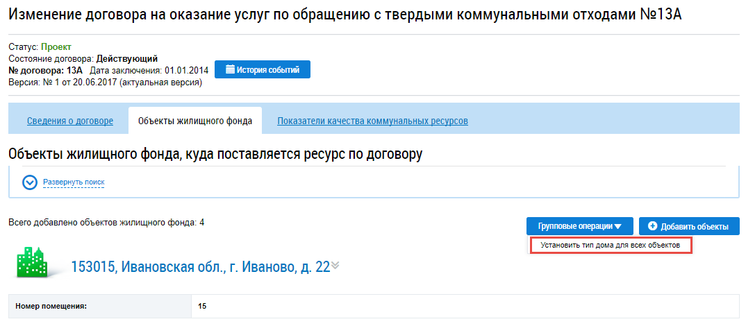 Система также предоставляет возможность установить тип дома для всех добавленных ОЖФ. Для этого нажмите на кнопку Групповые операции и выберите пункт контекстного меню Установить тип дома для всех объектов.