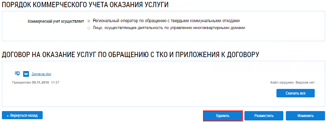 Удаление договора на оказание услуг по обращению с ТКО