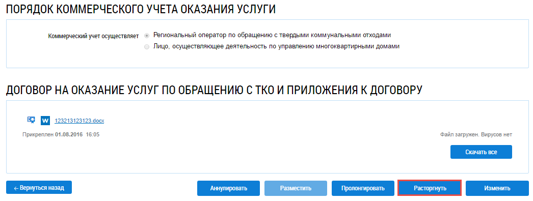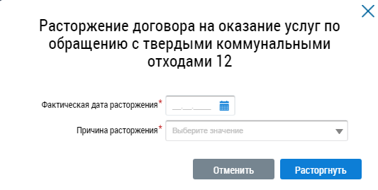 Отображается окно Расторжение договора на оказание услуг по обращению с твердыми коммунальными отходами.