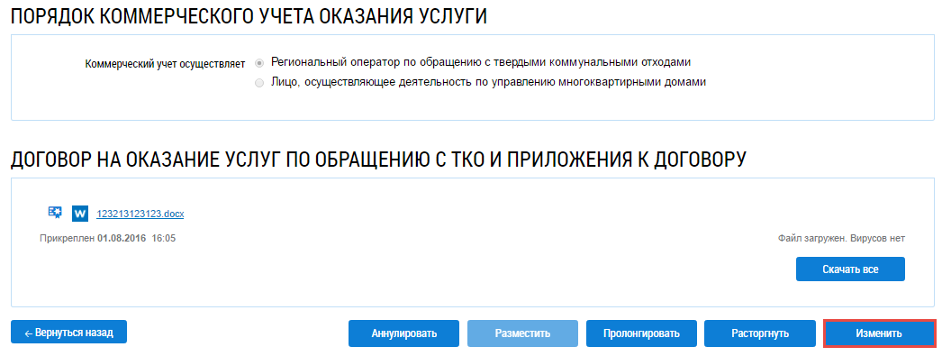 Отображается страница Изменение договора на оказание услуг по обращению с твердыми коммунальными отходами с внесенными ранее сведениями по договору.