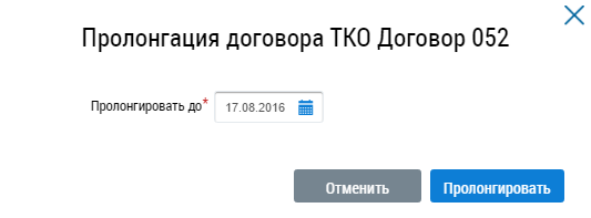 Для пролонгации договора на оказание услуг по обращению с ТКО выберите пункт контекстного меню Пролонгировать на странице Реестр договоров на оказание услуг по обращению с твердыми коммунальными отходами, либо нажмите на кнопку Пролонгировать на странице Просмотр договора на оказание услуг по обращению с твердыми коммунальными отходами.