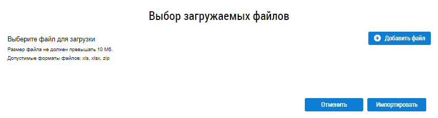 Нажмите на кнопку Добавить файл, выберите предварительно заполненный файл загрузки с Вашего компьютера. Дождитесь окончания загрузки файла и нажмите на кнопку Импортировать.