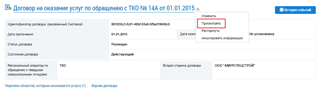 Для просмотра истории событий по договору нажмите на кнопку История событий на странице Реестр договоров на оказание услуг по обращению с твердыми коммунальными отходами, либо нажмите на кнопку История событий на странице Просмотр договора на оказание услуг по обращению с твердыми коммунальными отходами.