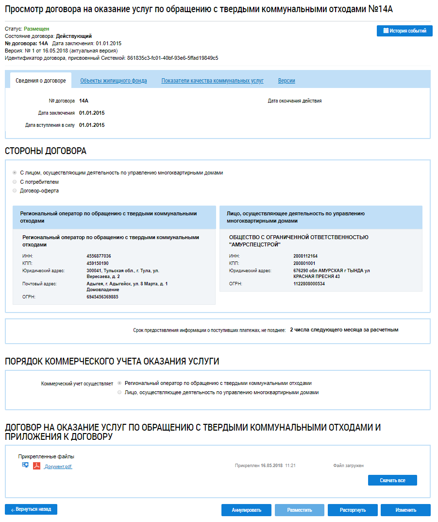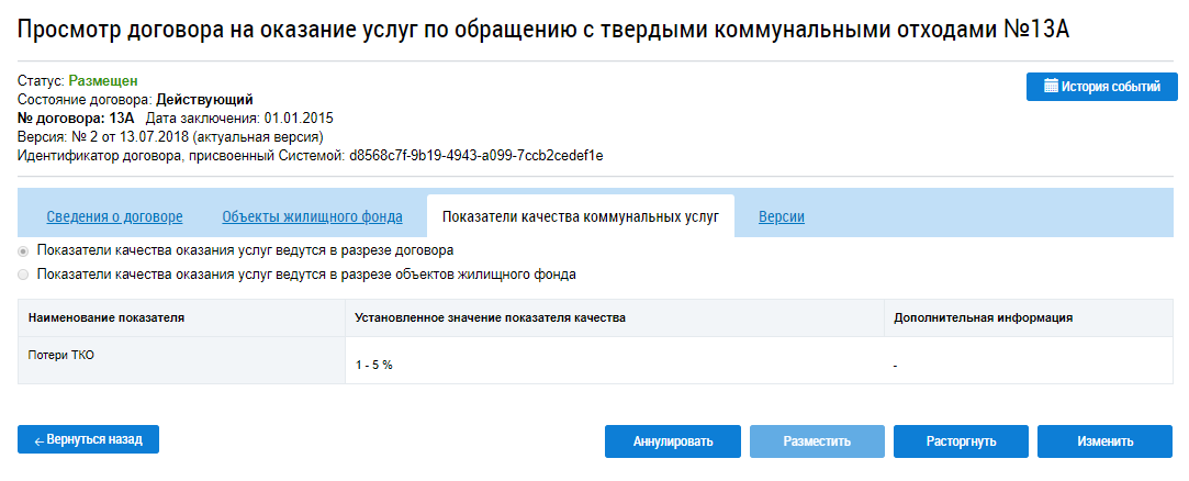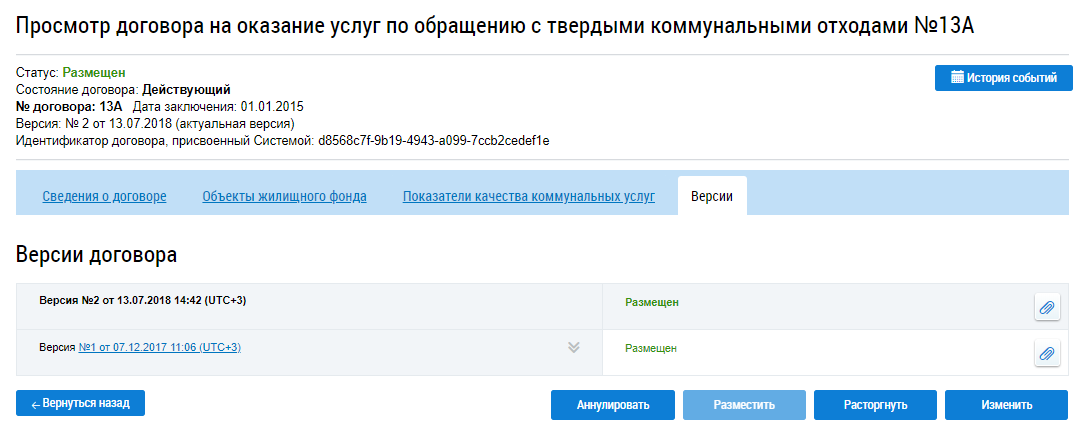 Для просмотра определенной версии договора нажмите на гиперссылку с ее номером. На новой странице отобразится информация о ранее размещенном договоре на оказание услуг по обращению с ТКО.