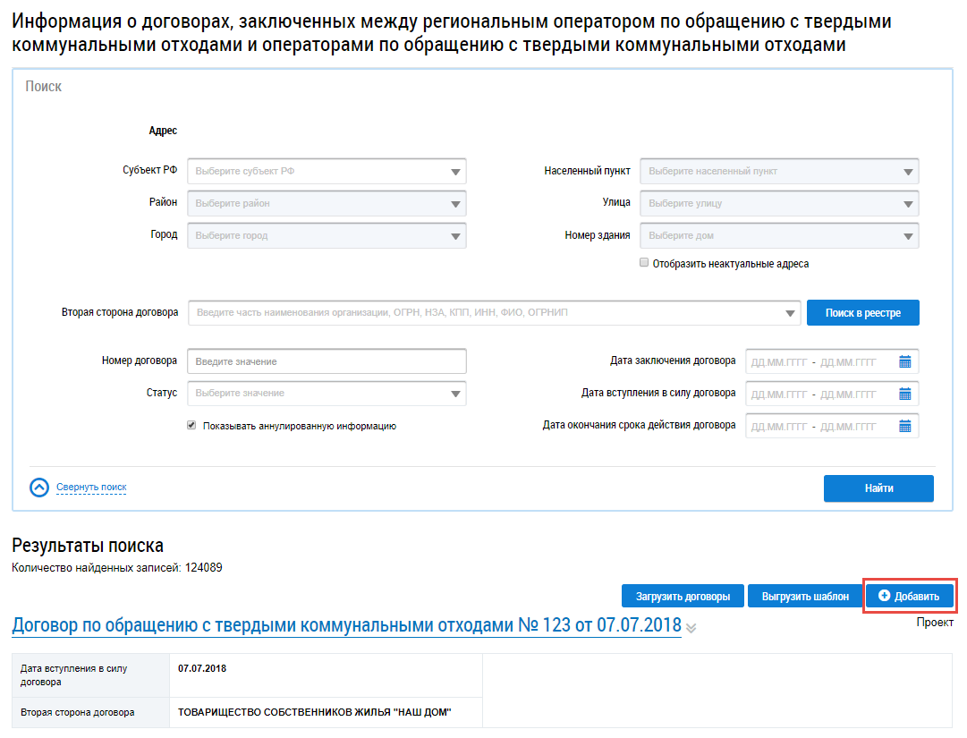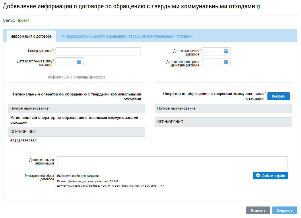 Отображается страница Добавление информации о договоре по обращению с твердыми коммунальными отходами.