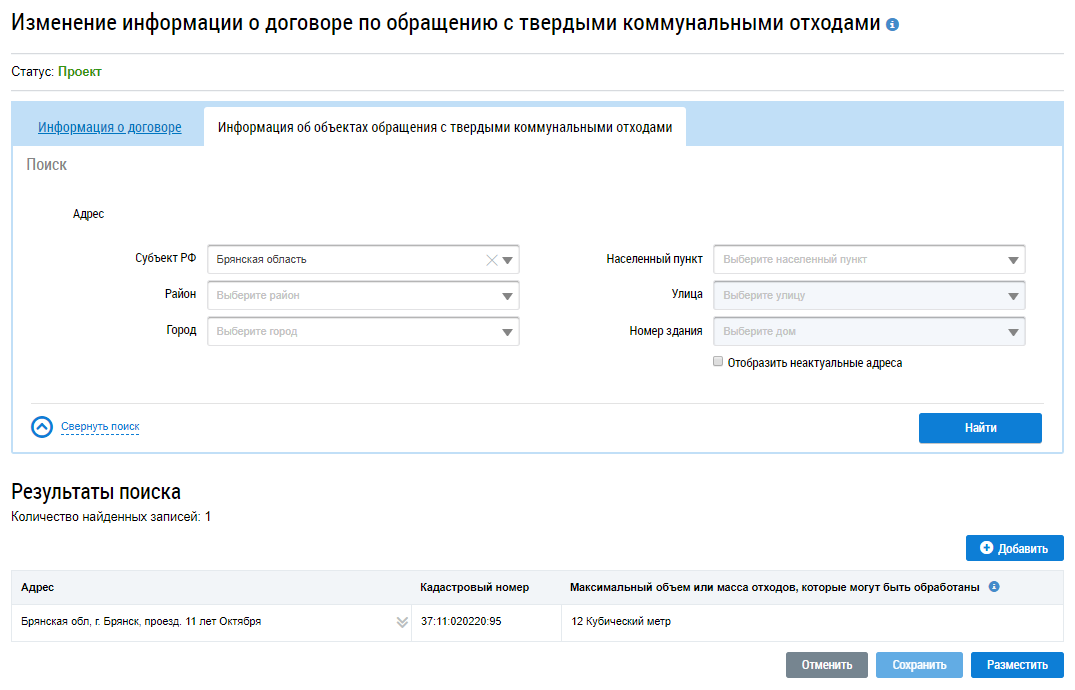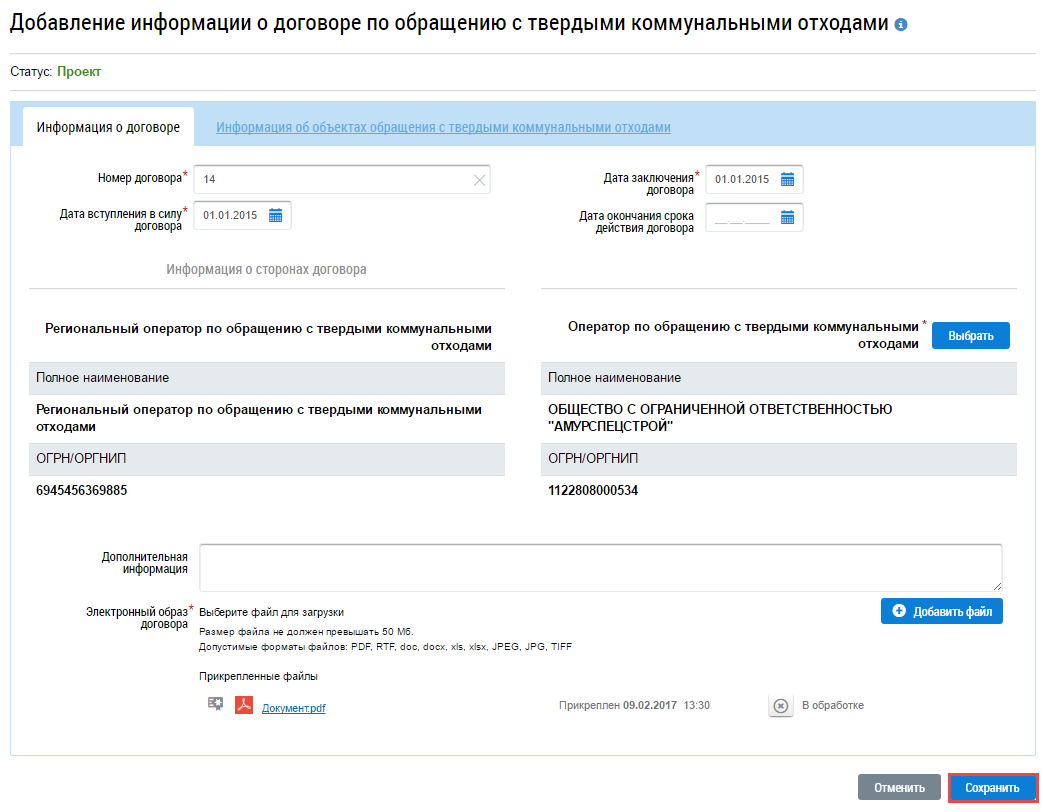 После добавления объектов обращения с ТКО нажмите на кнопку Сохранить. Договор сохраняется в статусе Проект.