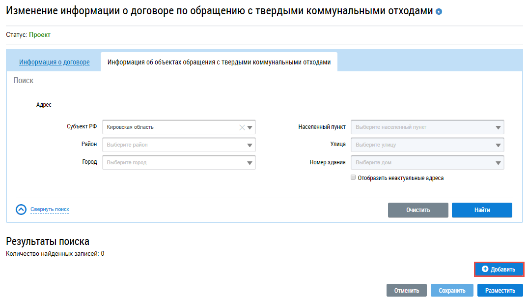 Для размещения договора необходимо добавить хотя бы один объект обращения с ТКО. Для этого перейдите на вкладку Информация об объектах обращения с твердыми коммунальными отходами и нажмите на кнопку Добавить.