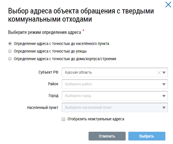 Выберите режим определения адреса – с точностью до населенного пункта, до улицы либо до дома/корпуса/строения – установив переключатель в соответствующее поле. Для заполнения полей адреса объекта последовательно выберите необходимые значения из выпадающих списков. Система предоставляет возможность выбрать актуальные и неактуальные адреса. Нажмите на кнопку Выбрать.