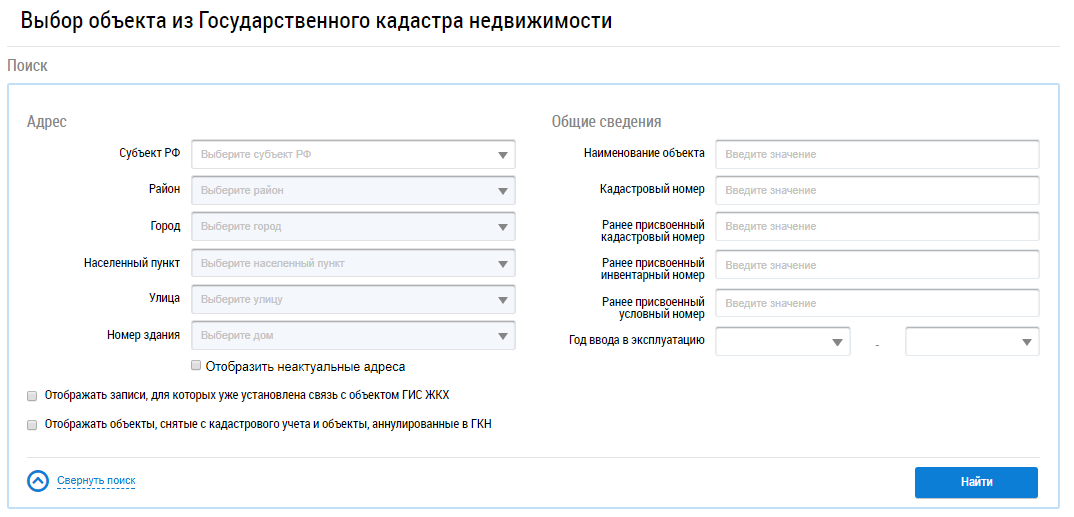 Заполните поля блока поиска; в случае необходимости отображения в результатах поиска неактуальных адресов, записей, для которых уже установлена связь с объектами ГИС ЖКХ, а также объектов, снятых с кадастрового учета и аннулированных в ГКН, установите флажки в соответствующие поля. Поиск кадастрового номера объекта обращения с ТКО возможен по одному или нескольким параметрам. Нажмите на кнопку Найти.