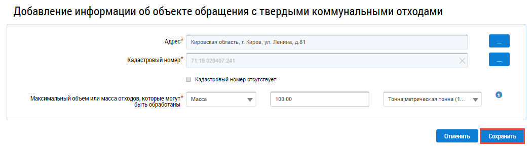Далее на странице Добавление информации об объекте обращения с твердыми коммунальными отходами укажите максимальный объем или массу отходов, которые могут быть обработаны, и нажмите на кнопку Сохранить.