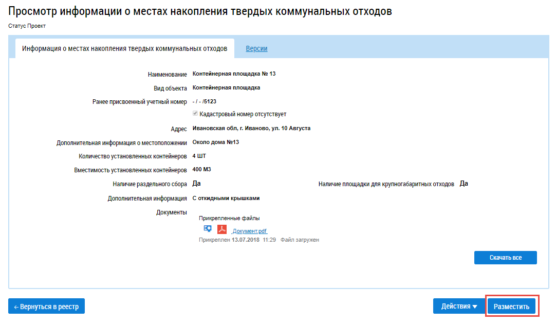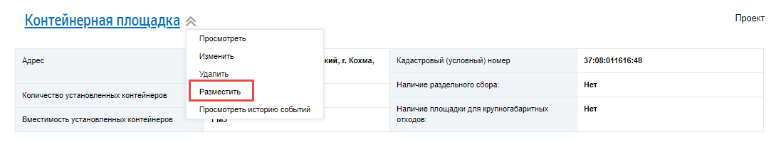 Для размещения информации о местах накопления ТКО выберите пункт контекстного меню Разместить на странице Информация о местах накопления твердых коммунальных отходов, либо нажмите на странице Просмотр информации о местах накопления твердых коммунальных отходов на кнопку Разместить.