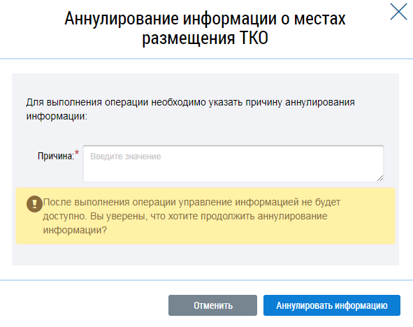 Отображается окно Аннулирование информации о местах накопления ТКО.