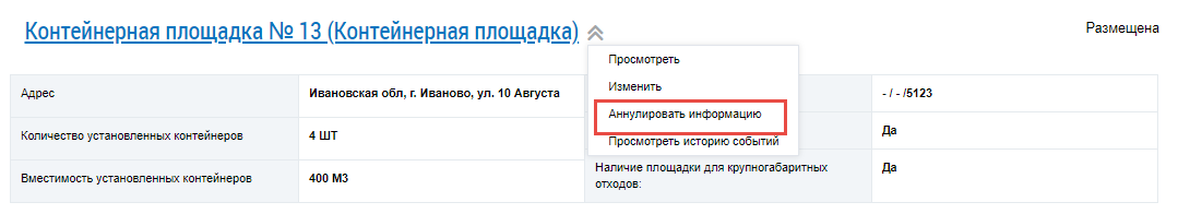 Операция аннулирования доступна для информации о местах накопления ТКО в статусе Размещена.