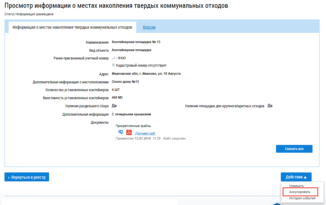 Для аннулирования информации о местах накопления ТКО и выберите пункт контекстного меню Аннулировать информацию на странице Информация о местах накопления твердых коммунальных отходов, либо нажмите на странице Просмотр информации о местах накопления твердых коммунальных отходов на кнопку Действия и выберите пункт Аннулировать.