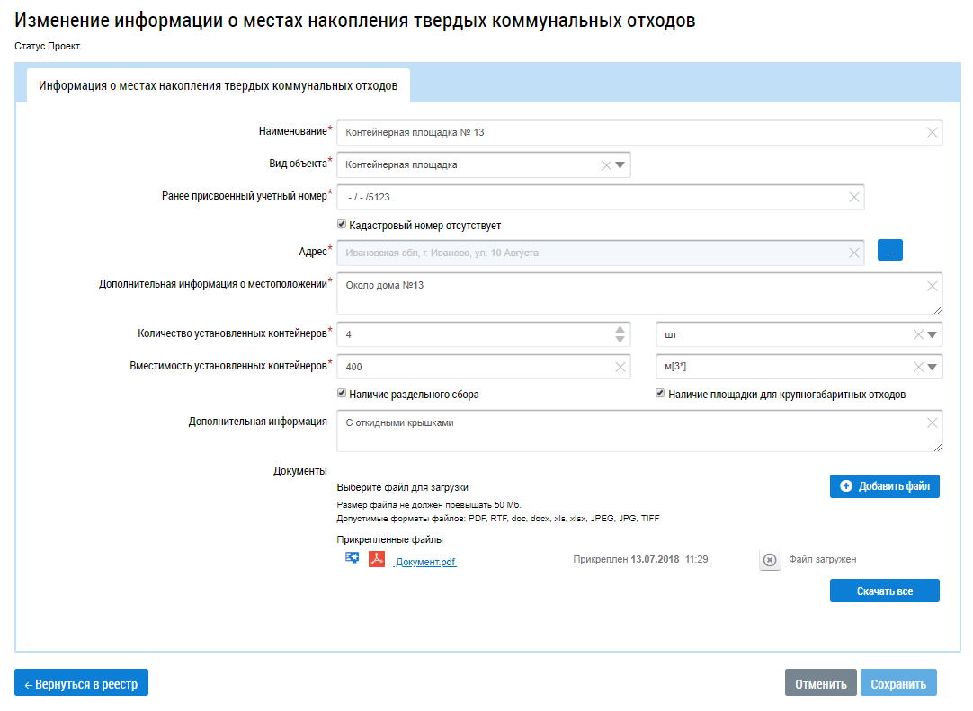 Отображается страница Изменение информации о местах накопления твердых коммунальных отходов с ранее внесенными сведениями.