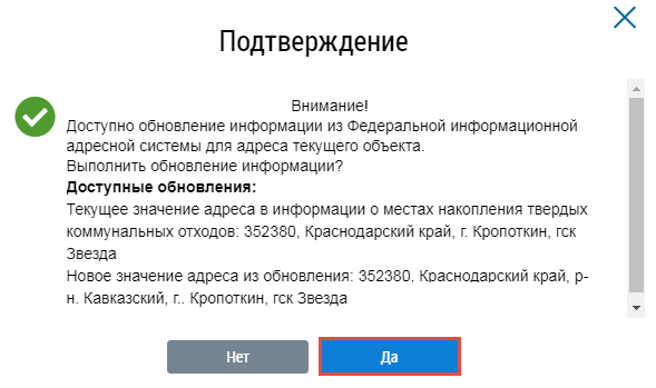 Если Системой найдено обновление адреса места накопления ТКО, отображается следующее окно подтверждения.