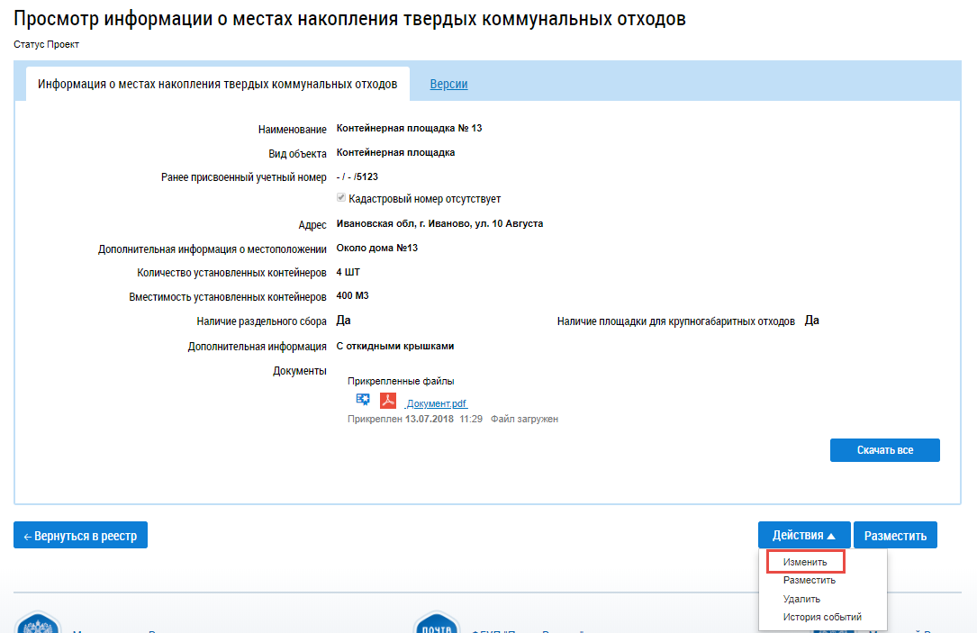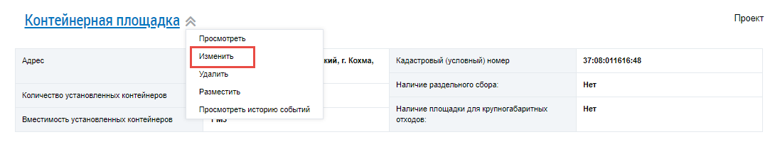 Для изменения информации о местах накопления ТКО выберите пункт контекстного меню Изменить, на странице Информация о местах накопления твердых коммунальных отходов либо на странице Просмотр информации о местах накопления твердых коммунальных отходов нажмите на кнопку Действия и выберите пункт Изменить.