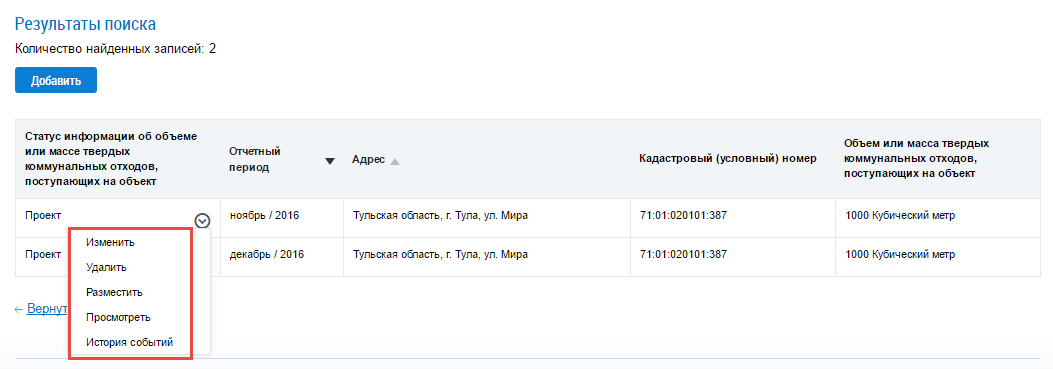 Чтобы разместить информацию об объеме и массе ТКО, выберите пункт контекстного меню Разместить на вкладке Информация об объеме или массе твердых коммунальных отходов, поступающих на объект.