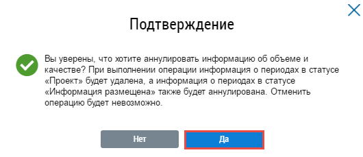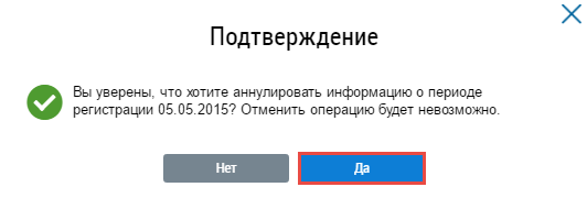 Система также предоставляет возможность аннулировать информацию о периоде регистрации. Операция аннулирования доступна для периодов регистрации в статусе Информация размещена.