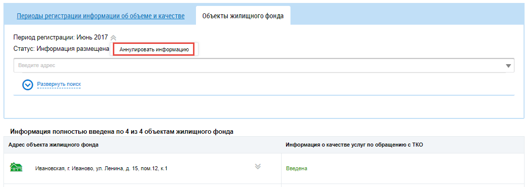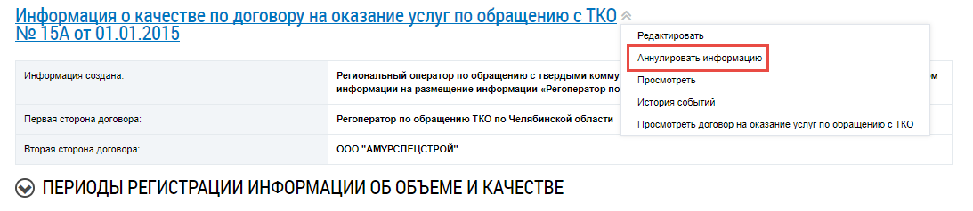 Чтобы аннулировать информацию о качестве оказания услуг по обращению с ТКО выберите пункт контекстного меню Аннулировать информацию на странице Качество услуг по обращению с твердыми коммунальными отходами.