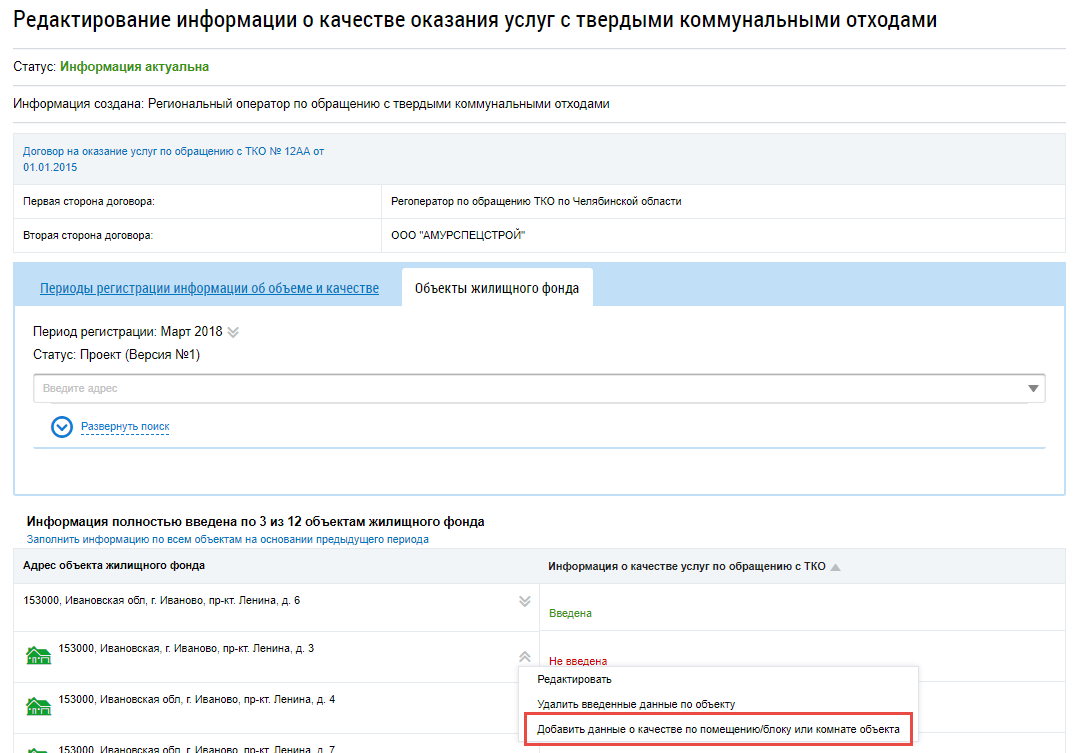 Чтобы добавить информацию о качестве оказания услуг по помещению, блоку или комнате, выберите пункт контекстного меню Добавить данные о качестве по помещению/блоку или комнате объекта.