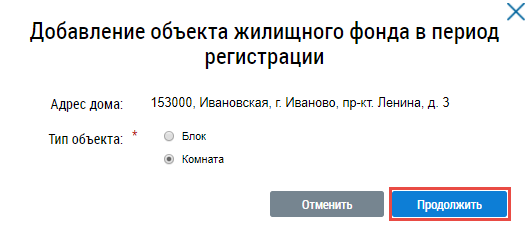 В отобразившемся окне Добавление объекта жилищного фонда в период регистрации установите переключатель напротив необходимого типа объекта и нажмите на кнопку Продолжить.