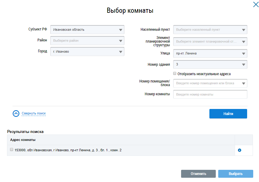 В отобразившемся окне установите переключатель напротив необходимых объектов жилищного фонда и нажмите на кнопку Выбрать.