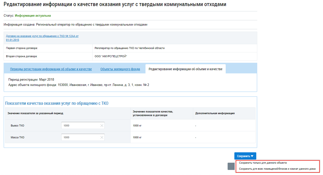 Отображается вкладка Редактирование информации об объеме и качестве. Укажите значения показателей качества, нажмите на кнопку Сохранить и выберите необходимое действие – сохранить только для данного объекта или сохранить для всех помещений/блоков и комнат данного дома.