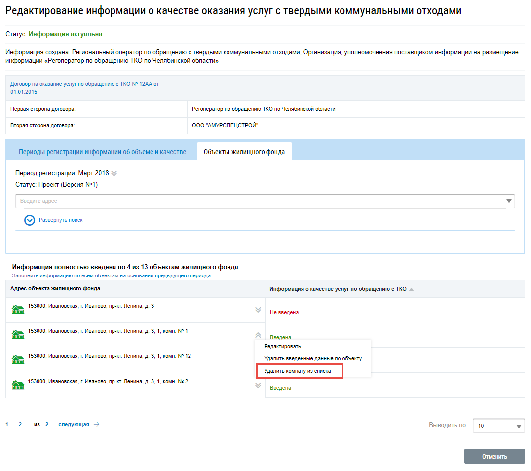 Удаление помещения, блока или комнаты из информации о качестве оказания услуг