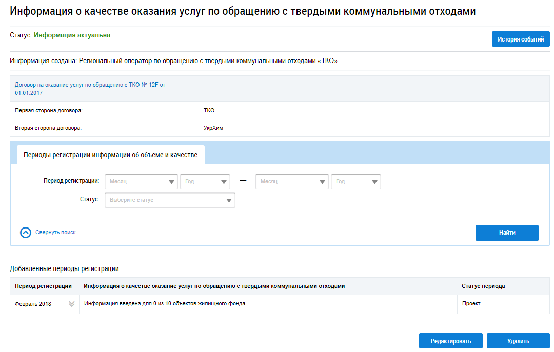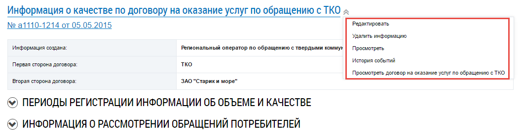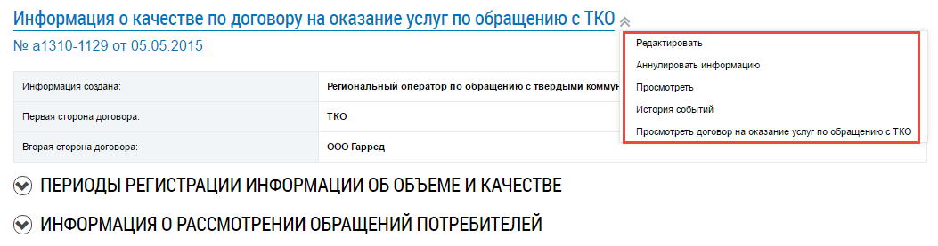 Чтобы просмотреть договор на оказание услуг по обращению с ТКО выберите пункт Просмотреть договор на оказание услуг по обращению с ТКО (Контекстное меню информации о качестве оказания услуг по обращению с ТКО при наличии размещенных или аннулированных периодов, Контекстное меню информации о качестве оказания услуг по обращению с ТКО в отсутствие размещенных и аннулированных периодов). Подробный просмотр договора описан в п. Договоры на оказание услуг по обращению с твердыми коммунальными отходами.