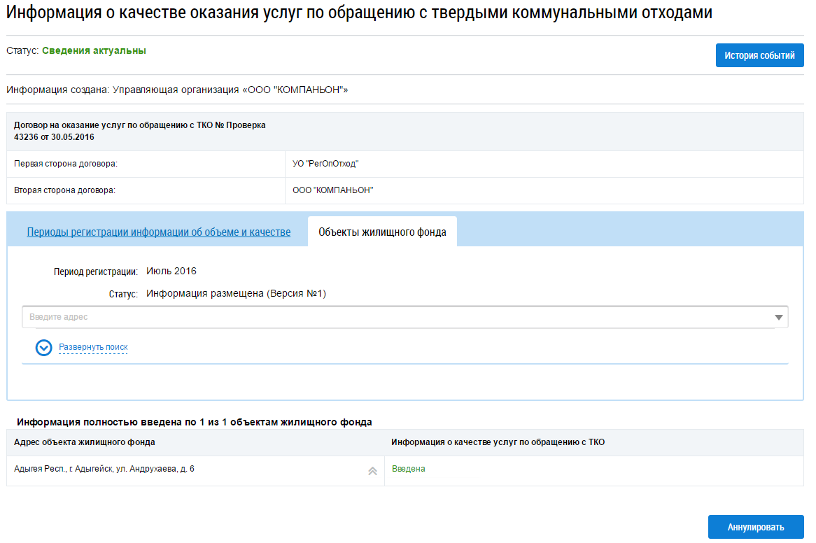 Для просмотра истории событий выберите пункт контекстного меню История событий (Контекстное меню информации о качестве оказания услуг по обращению с ТКО при наличии размещенных или аннулированных периодов, Контекстное меню информации о качестве оказания услуг по обращению с ТКО в отсутствие размещенных и аннулированных периодов).
