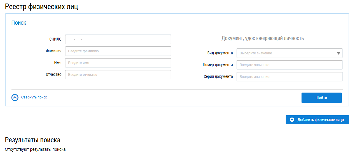 Данный раздел доступен после предоставления представителю организации права доступа Ведение реестра физических лиц. Для получения необходимых прав обратитесь к Администратору организации.