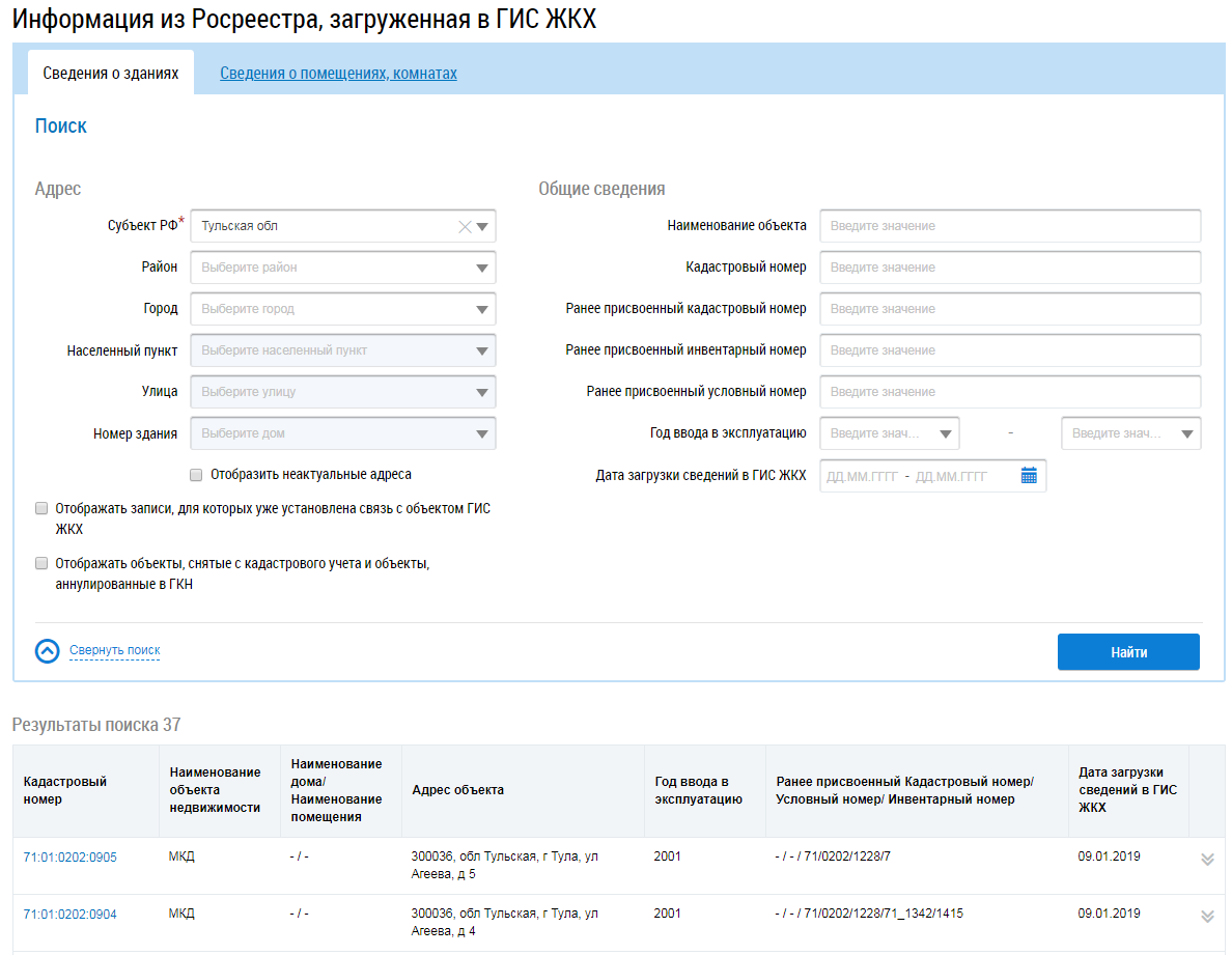 На вкладке Сведения о зданиях можно найти и просмотреть записи о зданиях из государственного кадастра недвижимости, загруженные в ГИС ЖКХ. На вкладке Сведения о помещениях, комнатах можно, соответственно, найти и просмотреть записи о помещениях и комнатах из государственного кадастра недвижимости, загруженные в ГИС ЖКХ. Кроме того, на обеих вкладках можно просмотреть дату первичной загрузки кадастрового номера в ГИС ЖКХ и выполнить поиск кадастровых номеров, загруженных за указанный период. Для записей, которые не привязаны к объектам жилищного фонда в ГИС ЖКХ, возможно инициировать процесс привязки объекта ГИС ЖКХ к кадастровому номеру.