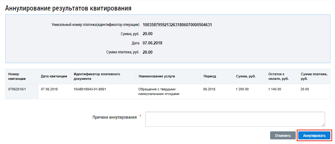 Укажите причину аннулирования результатов квитирования и нажмите на кнопку Аннулировать.