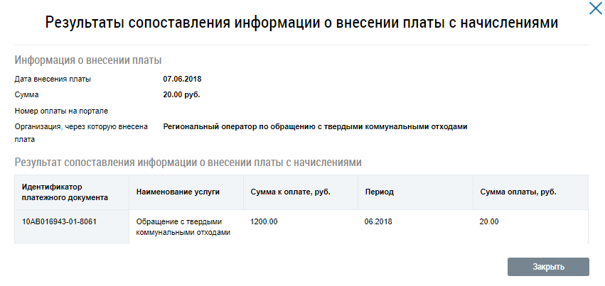 Отображается страница Результаты сопоставления информации о внесении платы с начислениями. Для возврата на страницу результатов квитирования нажмите на кнопку Закрыть.