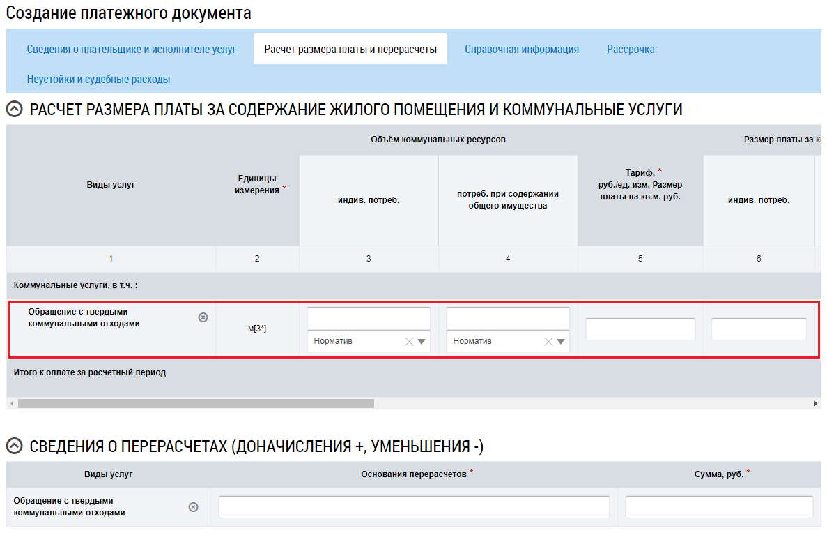 Заполните сведения о плательщике и исполнителе услуг и перейдите на вкладку Расчет размера платы и перерасчеты. Помимо платежных реквизитов подрядной организации необходимо указать только те услуги, по которым платежи поступают на счет подрядной организации.