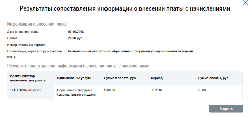 Отображается окно Результаты сопоставления информации о внесении платы с начислениями. Для возврата на страницу результатов квитирования нажмите на кнопку Закрыть.