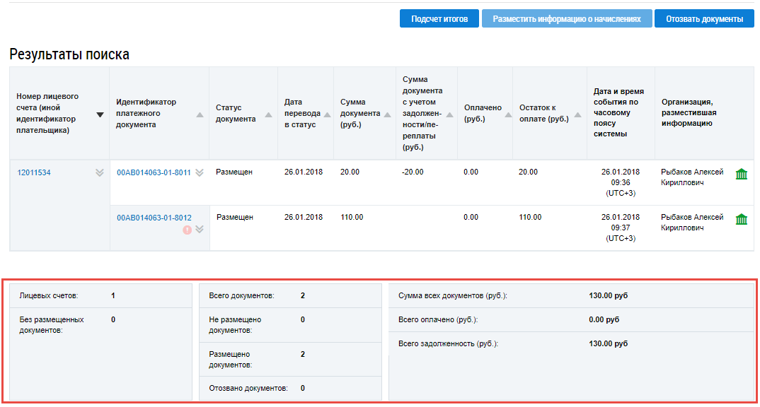 Для просмотра итогов по выбранному расчетному периоду установите в блоке поиска переключатель в поле Работа с добавленными ПД, выберите адрес дома и нажмите на кнопку Найти. Далее нажмите на кнопку Подсчет итогов.