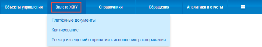 При нажатии на раздел горизонтального навигационного меню Оплата ЖКУ отображается контекстное меню раздела.