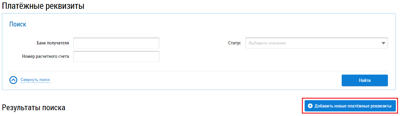 Для добавления платежных реквизитов нажмите на кнопку Добавить новые платежные реквизиты.