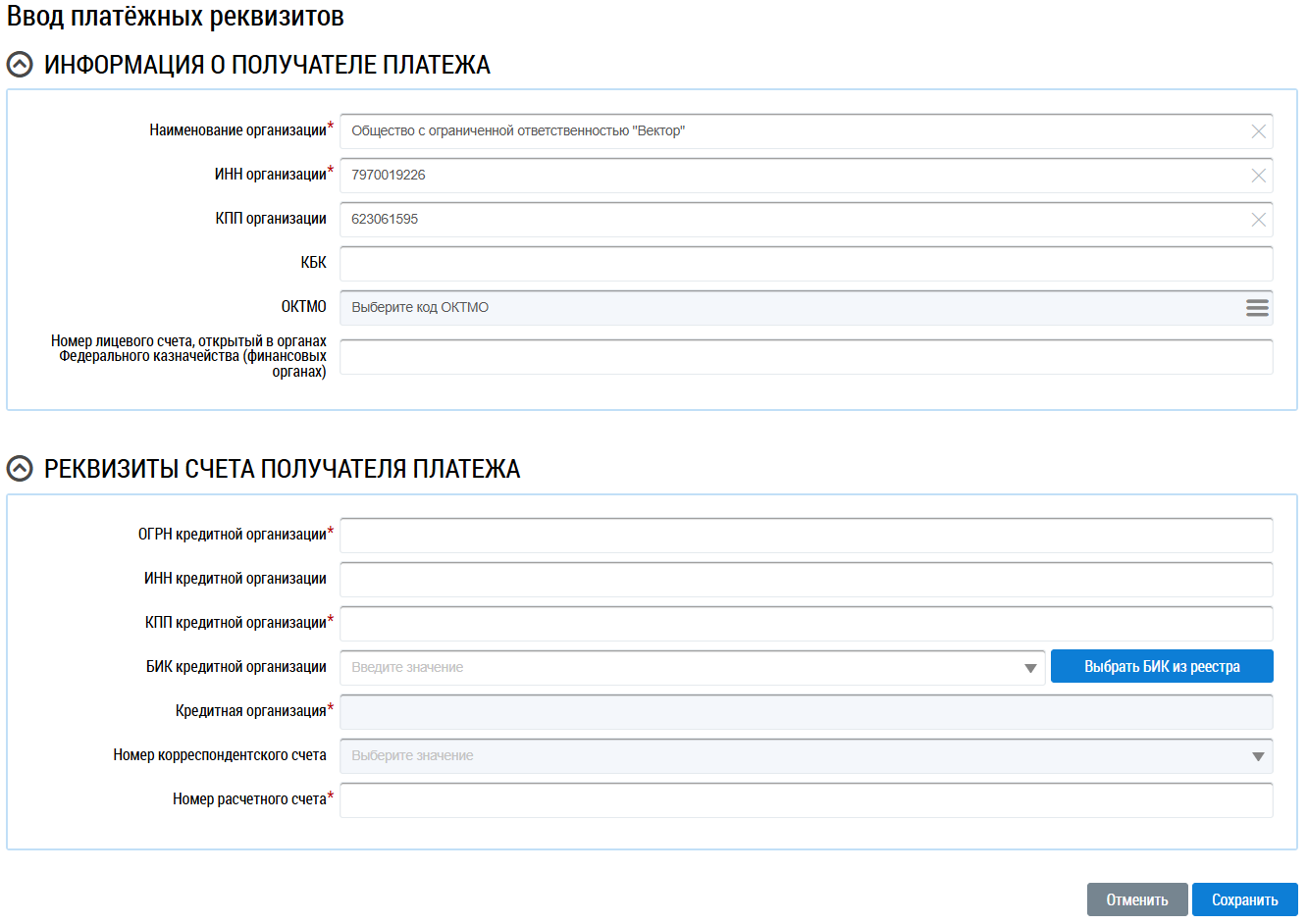 Добавление платежных реквизитов