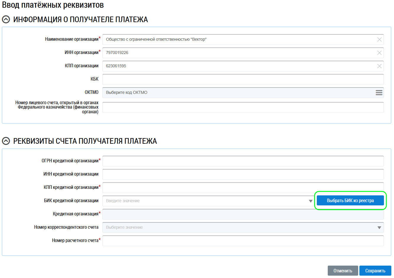 Для выбора банковского идентификационного кода кредитной организации необходимо нажать на кнопку Выбрать БИК из реестра.