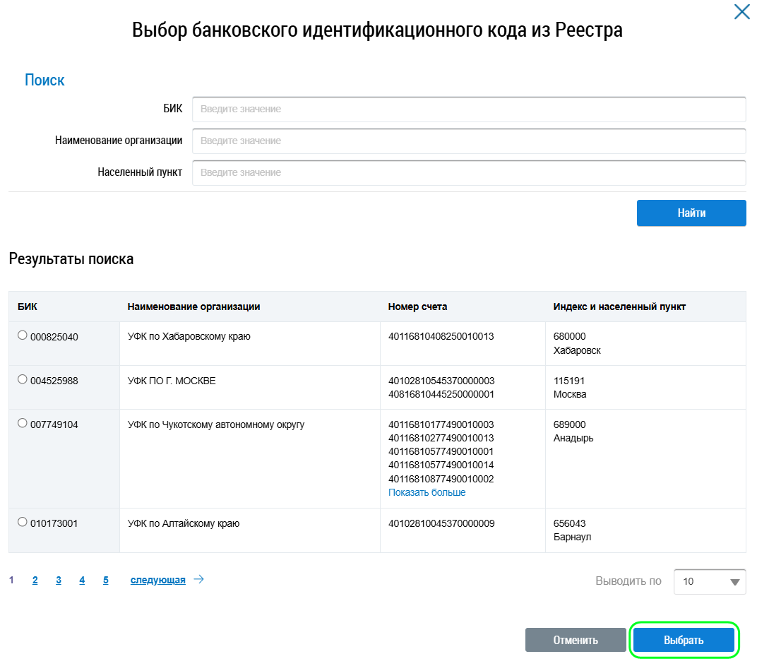 В отобразившемся окне Выбор банковского идентификационного кода из Реестра при необходимости воспользуйтесь блоком поиска.