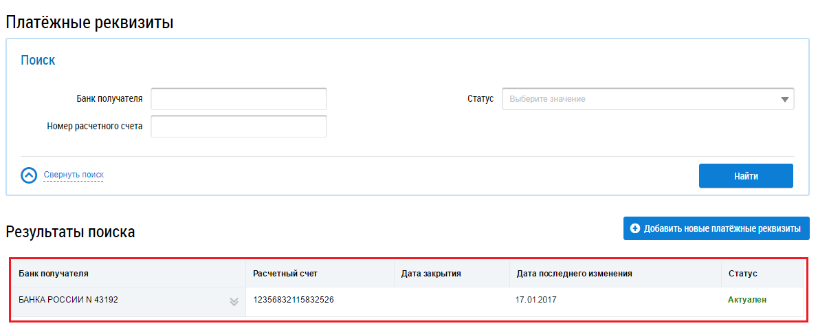 Задайте параметры поиска в блоке поиска. Для заполнения полей необходимо ввести банк получателя, номер расчетного счета и статус платёжного документа из выпадающего списка. Далее нажмите на кнопку Найти. В блоке результатов поиска отображается перечень банков, соответствующих заданным параметрам.