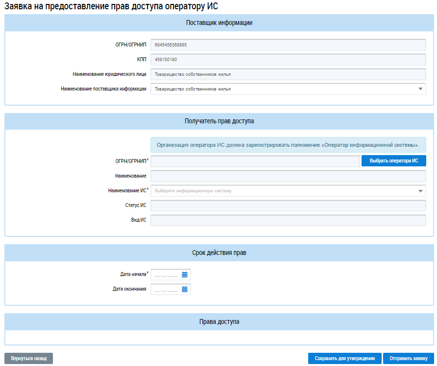 - администратору организации, который не является руководителем – с возможностью сохранения заявки без отправки Оператору ИС, для дальнейшего утверждения и отправки руководителем организации.