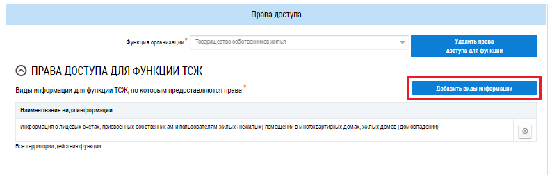 Укажите виды информации, по которым предоставляются права. Для добавления видов информации нажмите на кнопку Добавить виды информации.