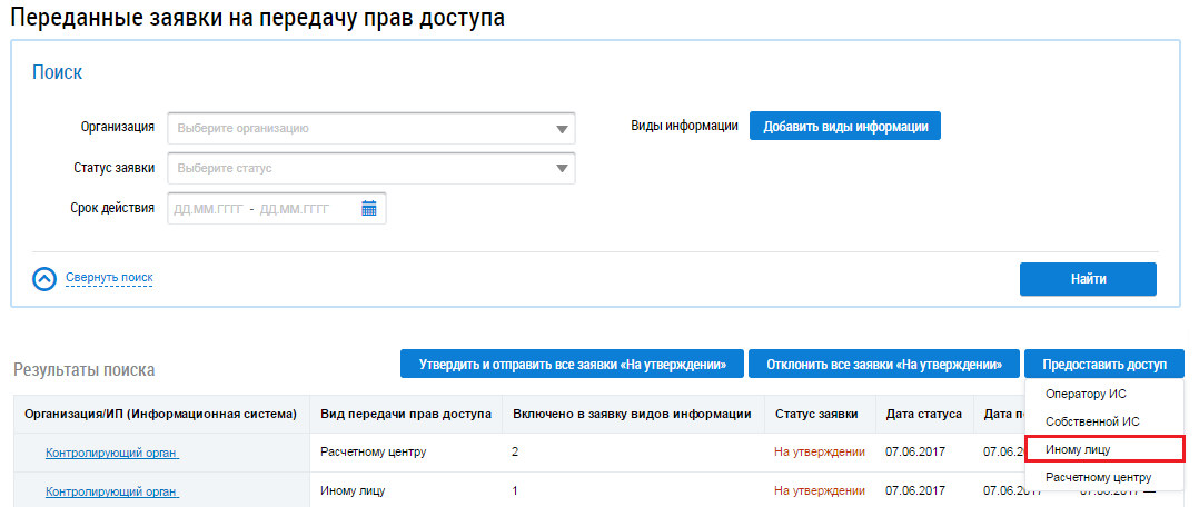 Для формирования заявки на предоставление прав доступа иному лицу нажмите на кнопку Предоставить доступ на странице Переданные заявки на передачу прав доступа и выберите в контекстном меню пункт Иному лицу.