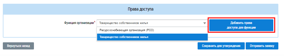 Заполните блок Права доступа. В случае наличия у организации нескольких функций выберите в выпадающем списке поля Функция организации необходимое значение и нажмите на кнопку Добавить права доступа для функции. Если у организации одна функция, данное поле не отображается.