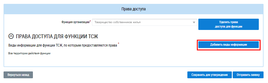 Укажите виды информации, по которым предоставляются права. Для добавления видов информации нажмите на кнопку Добавить виды информации.