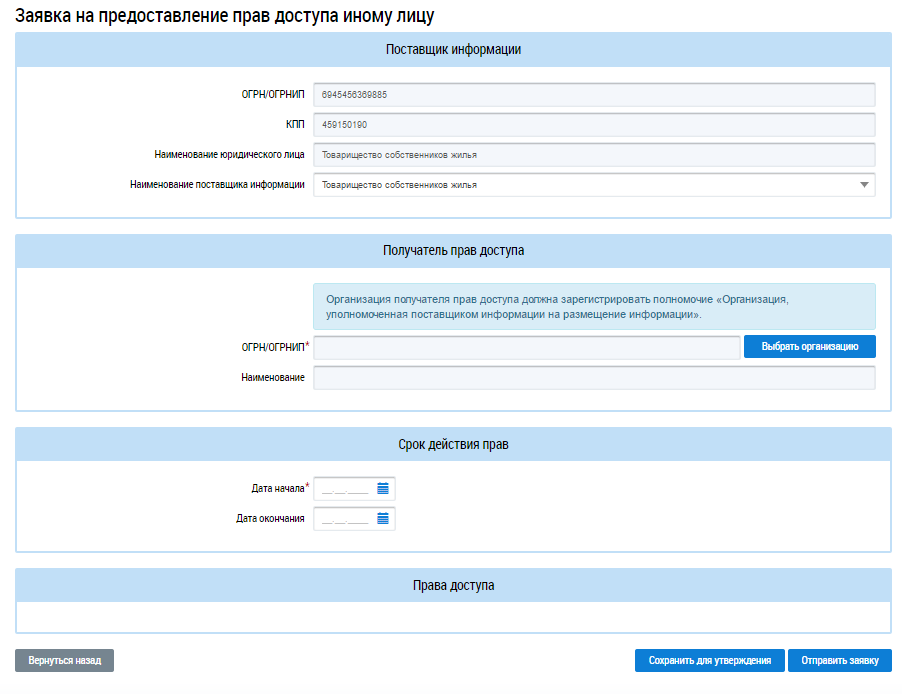 Отображается страница Заявка на предоставление прав доступа иному лицу.